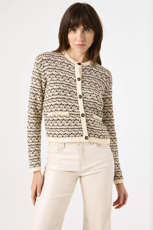 Vest met beige print en structuur. Het ideale item voor het najaar! Dit vest heeft een ronde hals, knoopsluiting, paspelzakken en een regular fit. Dit item is gemaakt van 42% katoen, 28% acryl, 17% viscose, 8% polyester en 5% metallic yarn. Better Cotton is een initiatief dat zich wereldwijd inzet voor betere omstandigheden in de katoenindustrie.