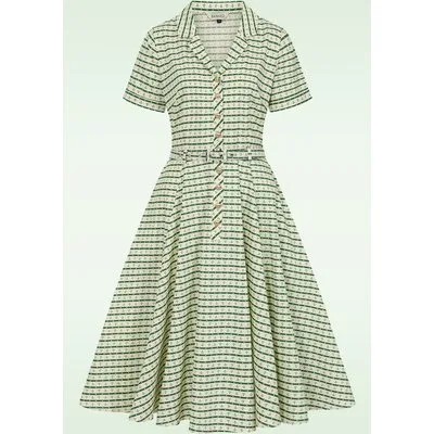 ''Steer yourself in the right direction!'' Deze luchtige swing beauty heeft een elegante V-halslijn, reverskraagje, korte mouwen en loopt uit in een prachtige swing rok, die jou een prachtig vrouwelijk silhouet geeft! Uitgevoerd in een soepele en luchtige, crème kleurige 100% katoen voorzien van een groene streepjes en ankertjes. * Swing model * V-halslijn * Reverskraagje * Korte mouwen met vaste omslagjes * Reeks knopen * Afneembare riem, voor een extra 'snatched' taille * Zijwaartse steekzakken * Valt bij een lengte van 1,70 m tot halverwege de kuit