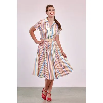 “Rainbow-bright and swing-ready.” Deze swing jurk heeft een elegante V-halslijn, reverskraagje, korte mouwen en loopt uit in een prachtige swing rok voor een super vrouwelijk silhouet. Uitgevoerd in een stevige, maar soepele 100% katoen (stretcht niet) in wit met een kleurrijke streepjesprint. * Swing model * V-halslijn * Reverskraagje * Korte mouwtjes met omslagjes * Reeks knopen * Afneembare riem * Zijwaartse steekzakken * Valt bij een lengte van 1,70 m tot halverwege de kuit