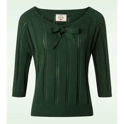 Deze 50s Belle Bow Pointelle Top in Forrest Green is er eentje om verliefd op te worden! De top heeft een mooie ronde halslijn met een speelse strik en 3/4 mouwtjes, cute! Uitgevoerd in een heerlijk soepele, stretchy, fijngebreide, donkergroene viscosemix met een klassiek opengewerkt patroon. Een veelzijdige top die niet mag ontbreken in de kast van een echte vintage lady! * Ronde halslijn * Vaste strik * 3/4 mouwtjes * Stretchy ribboorden * Lang genoeg om op een normale heupbroek te dragen