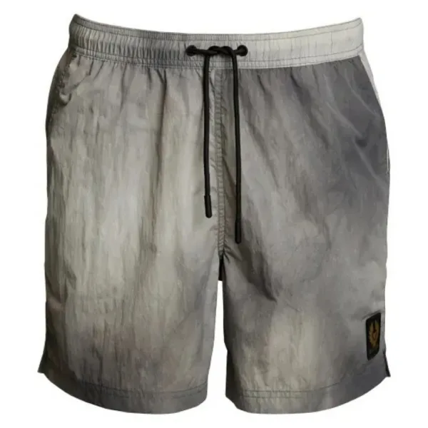 Belstaff grijze short, elastische tailleband, trekkoorden, 100% polyester, gemaakt in China, Belstaff-logo, grijze short