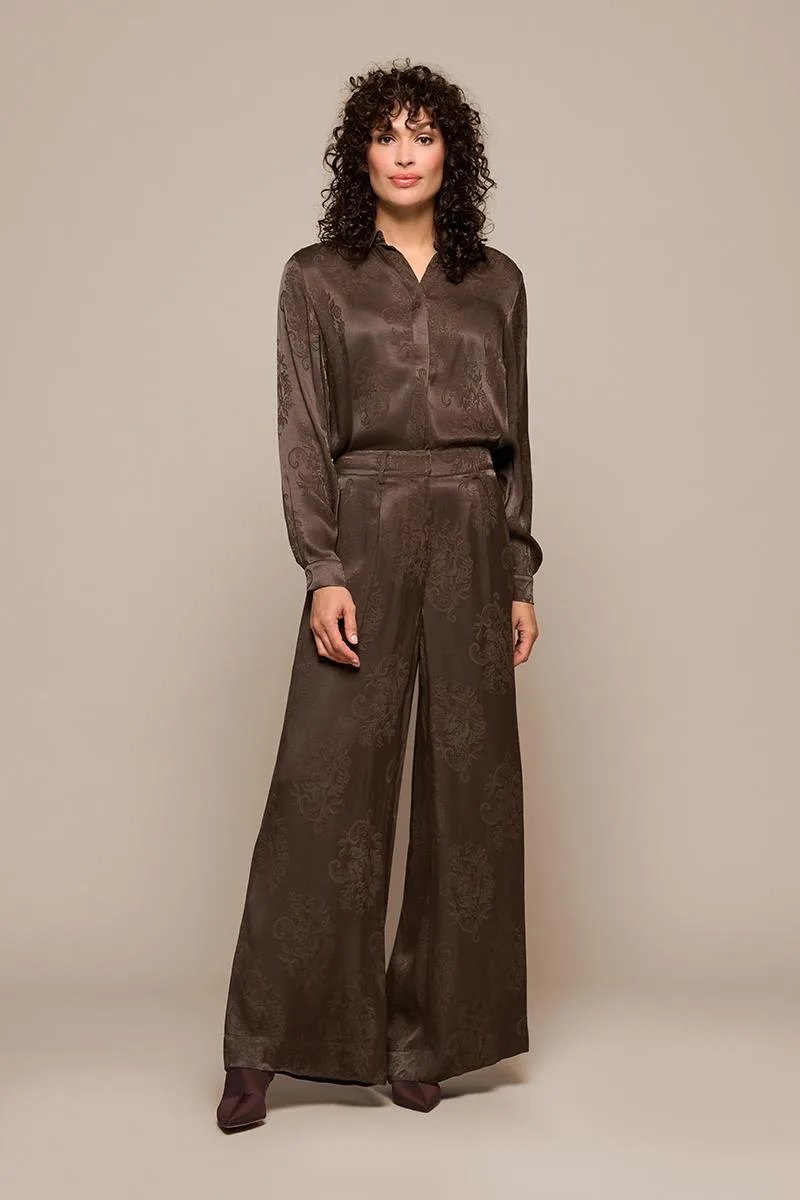 De donkerbruine jacquard pantalon van Mart Visser is een stijlvolle essential die moeiteloos elegantie en comfort samenbrengt. Met zijn rechte, wijdvallende model straalt de broek een tijdloze klasse uit en leent hij zich uitstekend voor uiteenlopende gelegenheden. De hoge taille, afgewerkt met elastiek aan de achterkant, garandeert een perfecte pasvorm en veel draaggemak. Voorzien van schuine steekzakken aan de voorzijde en elegante strookzakken achter, biedt de pantalon een subtiel chique afwerking. Het ingeweven jacquard bloemenpatroon geeft het geheel een luxe uitstraling en een rijke textuur. Combineer de pantalon met de bijpassende Bension of Bellize blouse voor een elegante ton-sur-ton outfit, of draag hem met een lichte top in beige of crème voor een meer casual maar verfijnde look. Fashiontip: kies voor gouden accessoires en een minimalistische clutch om de jacquarddetails extra te accentueren. Dankzij de hoogwaardige afwerking en luxe stoffen blijft de pantalon mooi in vorm en comfortabel dragen, seizoen na seizoen. Ook verkrijgbaar in navy en zwart voor een tijdloze variatie.