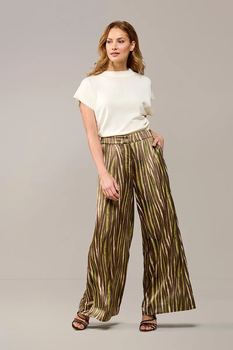Ervaar ultieme stijl en comfort met deze geweven printbroek. De wijde, rechtvallende pasvorm geeft de broek een moderne en verfijnde uitstraling, perfect voor zowel formele als informele gelegenheden. De hoge taille met een elastische tailleband aan de achterkant zorgt voor een flatterende pasvorm en draagt heerlijk comfortabel. De broek is voorzien van handige schuine steekzakken aan de voorkant en decoratieve strookzakken aan de achterkant, wat een elegante finishing touch geeft. Het abstracte streeppatroon in groen op een warme bruine achtergrond straalt luxe uit en maakt de broek een tijdloze toevoeging aan je garderobe. Combineer met de bijpassende Bension blouse voor een stijlvolle jumpsuit-look of kies voor een contrasterende top voor een frisse, casual outfit. Deze broek is een must-have voor elke modebewuste vrouw dankzij het prachtige design en de hoogwaardige kwaliteit