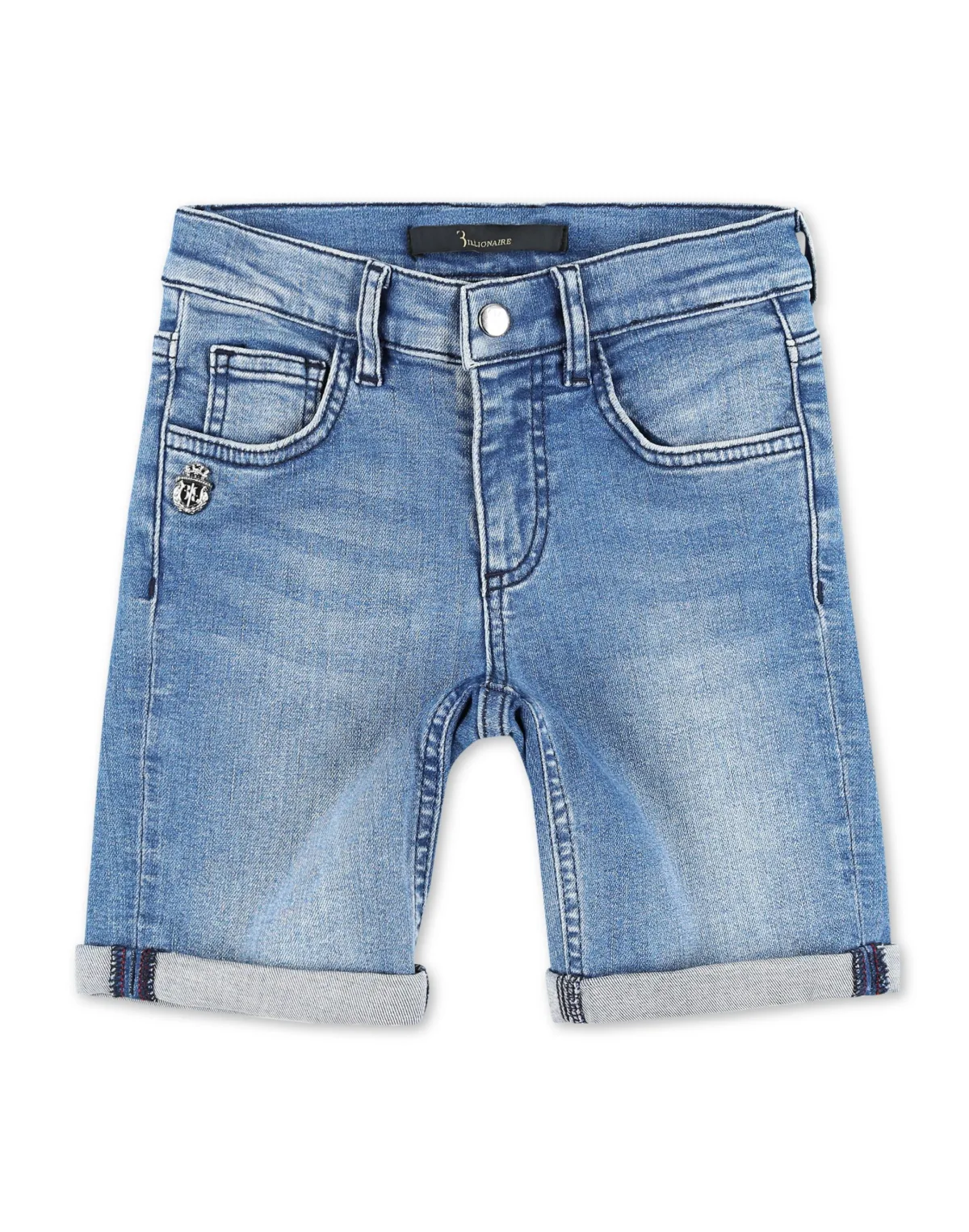 The classic denim 5 pocket bermuda shorts are a must in every child's wardrobe. This non washed stretch version features single metal button fastening. Both rear pockets are decorated with leather inserts. The brand's iconic crest is embroidered on the right one. Turn-up bottom.