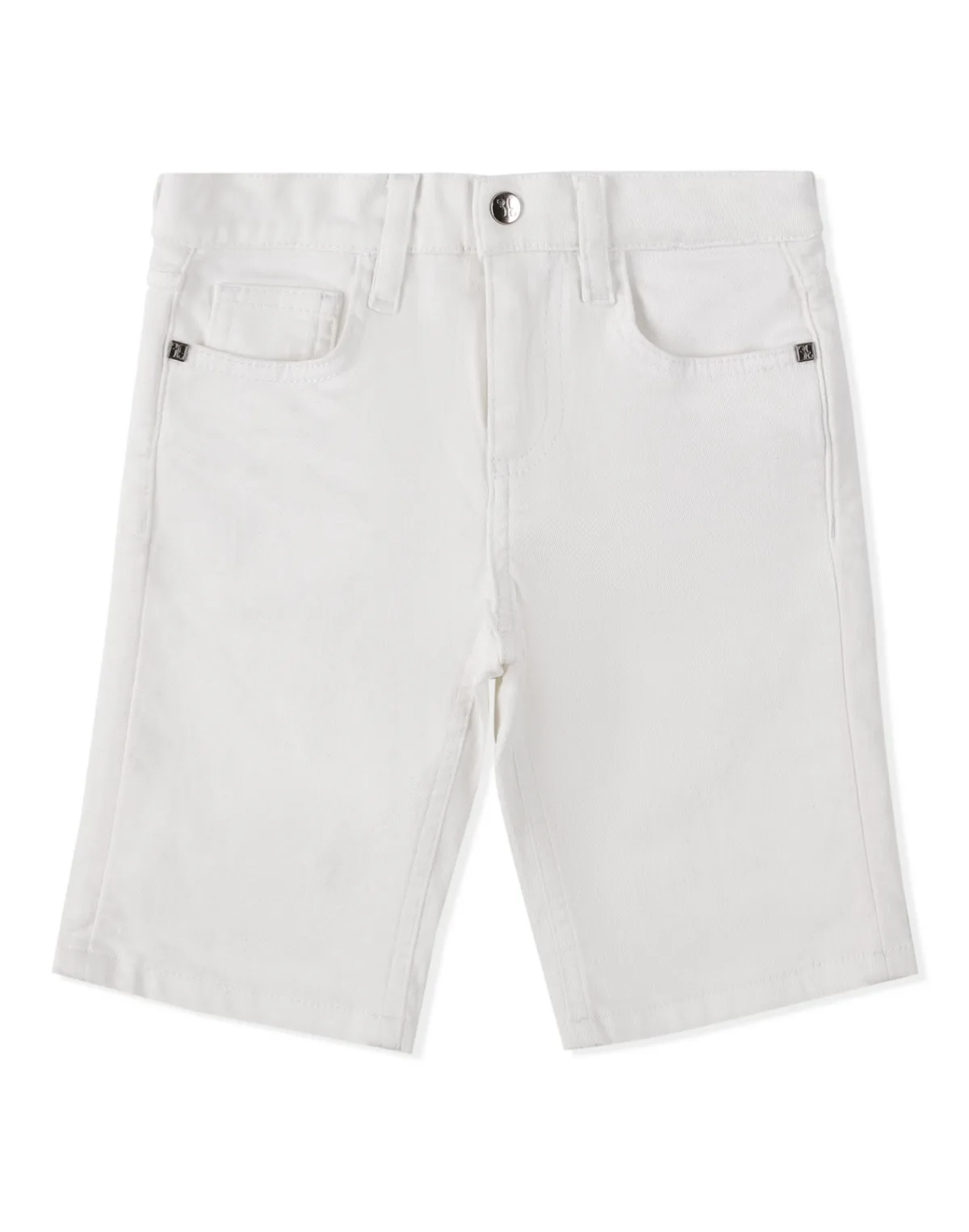 The bermuda version of the classic stone washed denim 5 pocket pants cannot miss even in the wardrobe of a kid. This version features one metal button at waist. The right rear pocket is decorated with a patch embroidered with the Maison’s iconic emblem.