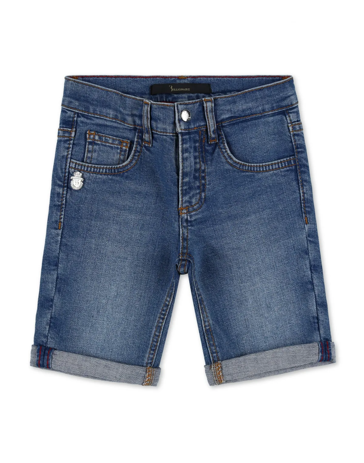 No kid’s wardrobe should be without the bermuda version of the classic denim 5 pocket pants. This version features one metal button at waist. The brand's lettering is embroidered on the right rear pocket and the double B monogram is made of leather. Turn-up bottom.