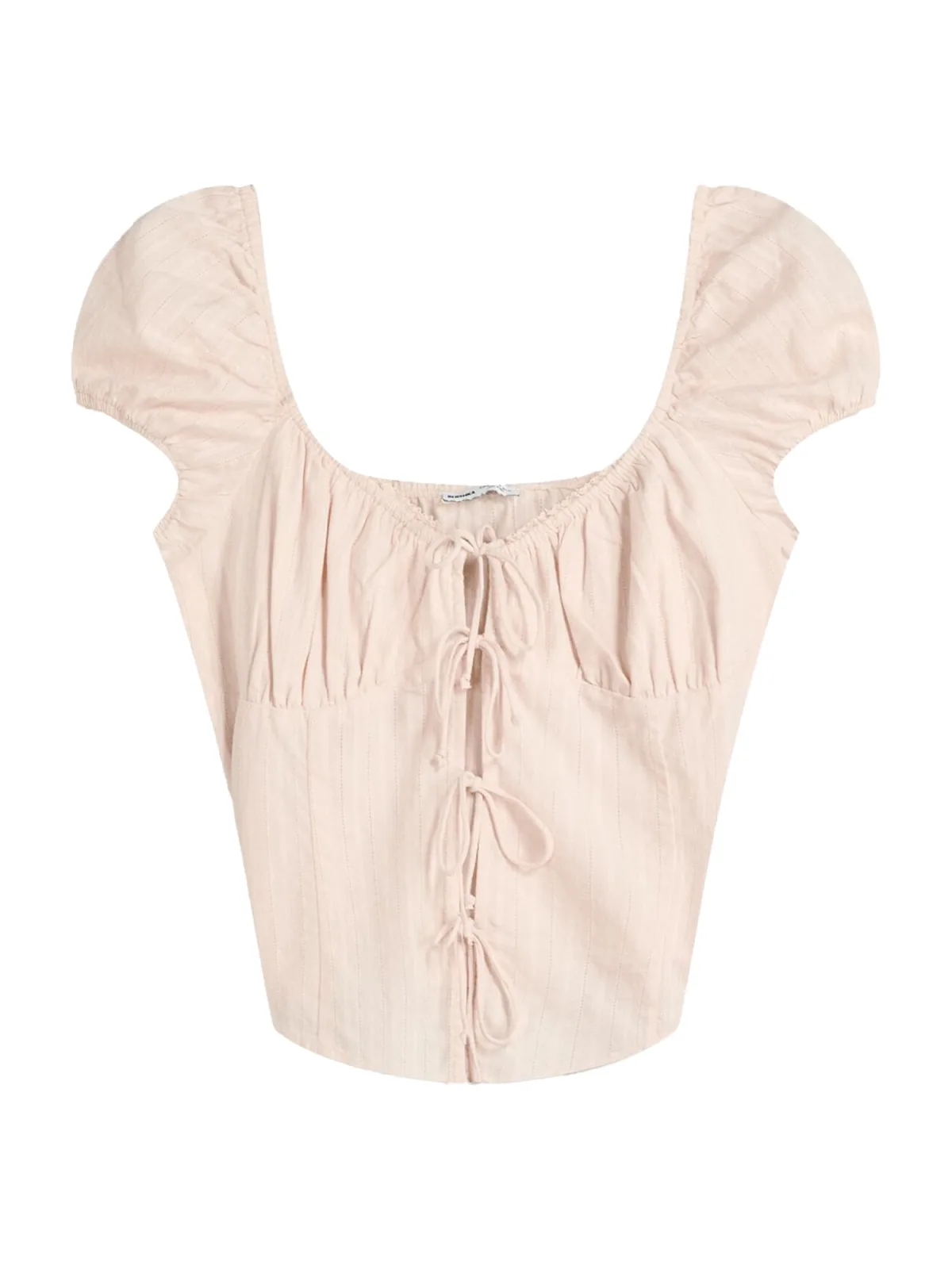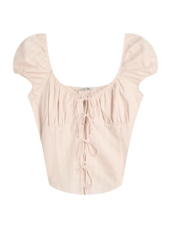 Blouse type: Klassieke blouse; Design: Gevoerde zoom/rand, Diepe snit/decolleté, Om te knopen/binden; Materiaal: Katoen; Motief: Krijtstrepen; Kraag: Zonder kraag; Details: Kant, Gedrapeerd; Extra's: Op staal naden, Lichte stof, Voelt zacht aan; Pasvorm: Slanke pasvorm; Armlengte: Kwartmouw; Lengte: Normale lengte
