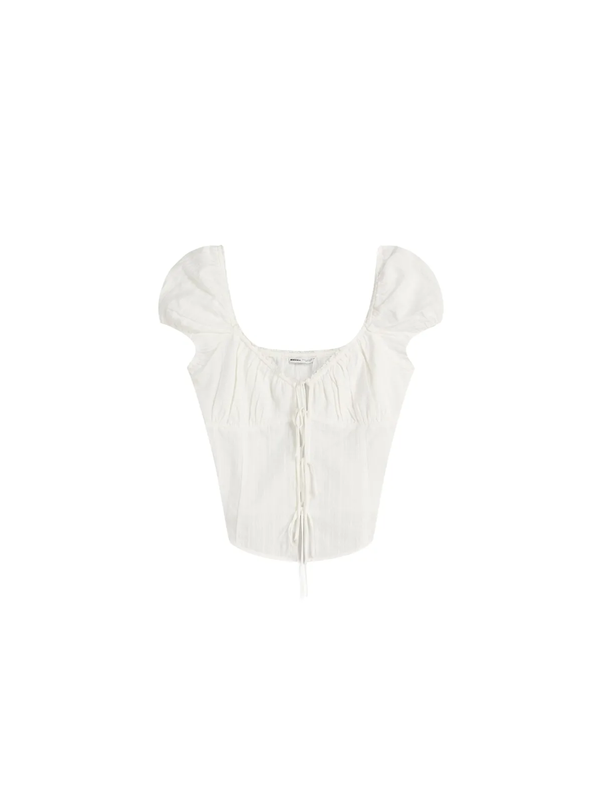 Blouse type: Klassieke blouse; Design: Gevoerde zoom/rand, Pofmouwen, Om te knopen/binden; Materiaal: Katoen; Motief: Effen; Kraag: Zonder kraag; Details: Kant, Gedrapeerd; Extra's: Op staal naden, Voelt zacht aan; Pasvorm: Slanke pasvorm; Armlengte: Kwartmouw; Lengte: Normale lengte