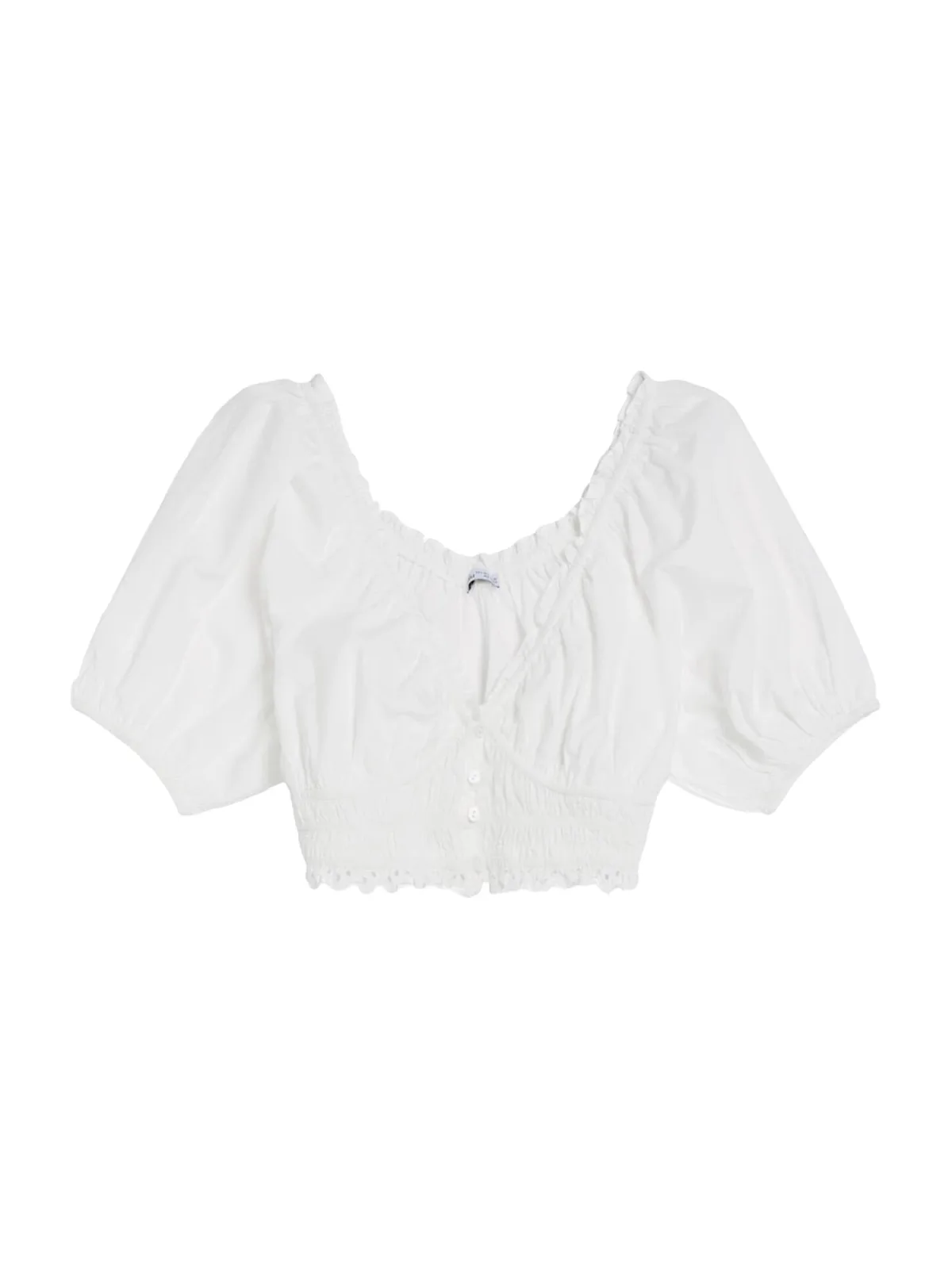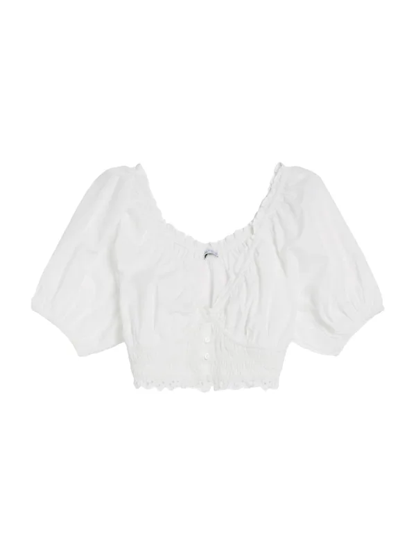 Blouse type: Blouseshirt; Design: Pofmouwen, Diepe snit/decolleté, Geschulpte zoom; Materiaal: Katoen; Motief: Effen; Kraag: Zonder kraag; Details: Borduursels, Gedrapeerd, Mesh; Extra's: Op staal naden, Voelt zacht aan; Pasvorm: Slanke pasvorm; Armlengte: Kwartmouw; Lengte: Korte pasvorm