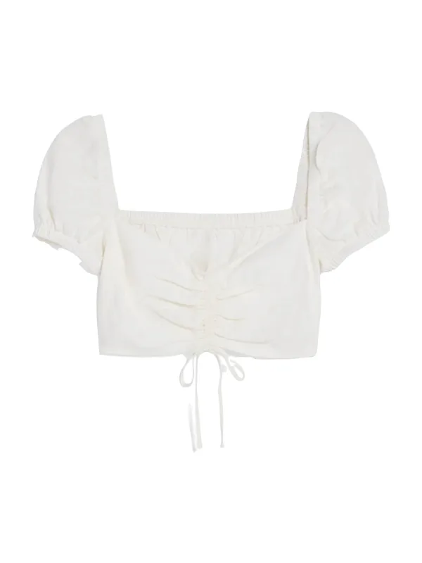 Blouse type: Blouseshirt; Design: Elastische taille/zoom, Diepe snit/decolleté, Om te knopen/binden; Materiaal: Linnen; Motief: Effen; Kraag: Zonder kraag; Details: Gedrapeerd; Extra's: Op staal naden, Voelt zacht aan; Pasvorm: Slanke pasvorm; Armlengte: Kwartmouw; Lengte: Korte pasvorm