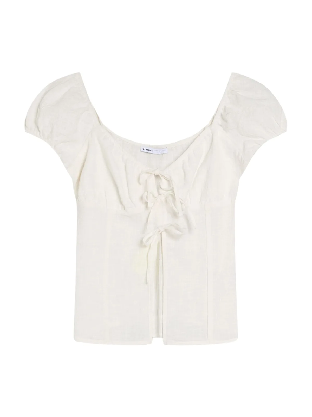 Blouse type: Wijde blouse; Design: Gevoerde zoom/rand, Pofmouwen, Om te knopen/binden; Materiaal: Katoen; Motief: Mélange; Kraag: Zonder kraag; Details: Gedrapeerd; Extra's: Op staal naden, Met textuur; Pasvorm: Slanke pasvorm; Armlengte: Kwartmouw; Lengte: Normale lengte