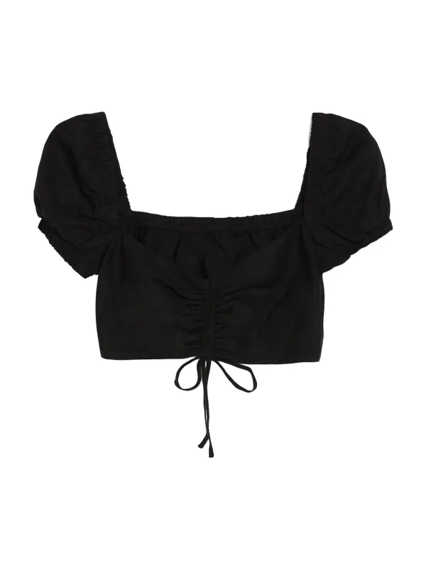 Blouse type: Blouseshirt; Design: Elastische taille/zoom, Rechte zoom, Diepe snit/decolleté, Om te knopen/binden; Materiaal: Linnen; Motief: Effen; Kraag: Zonder kraag; Details: Gedrapeerd; Extra's: Op staal naden, Voelt zacht aan; Pasvorm: Slanke pasvorm; Armlengte: Kwartmouw; Lengte: Korte pasvorm