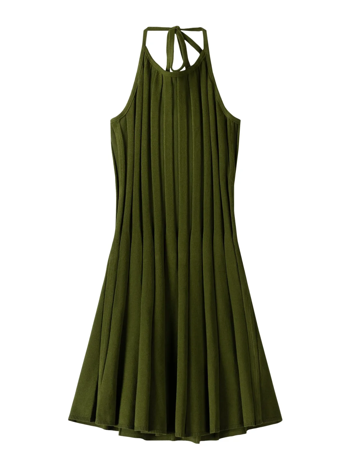 Design: Geribd ceintuurtje, Uitgesneden rug; Materiaal: Knitwear; Halstype: Carréhals; Motief: Effen; Soort bandjes: Haltermodel; Extra's: Op staal naden, Met textuur; Lengte: Knielengte; Snit: Uitlopend; Pasvorm: Normale pasvorm; Armlengte: Mouwloos