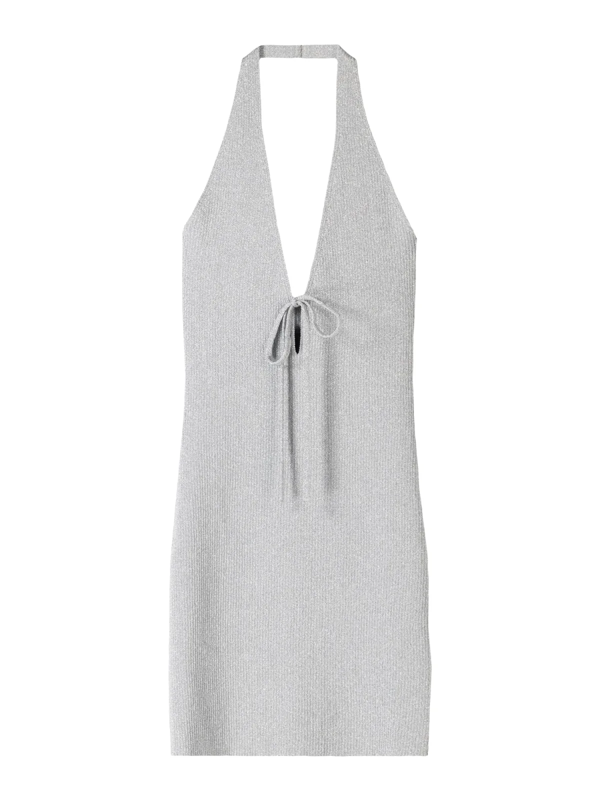 Design: Rechte zoom, Geribbeld gebreid, Om te knopen/binden; Materiaal: Knitwear; Halstype: V-hals; Motief: Effen; Soort bandjes: Haltermodel; Details: Cut-outs, Backless; Extra's: Glitterend, Met textuur; Lengte: Kort/mini; Snit: Figuur omarmend; Pasvorm: Aansluitende pasvorm; Armlengte: Mouwloos