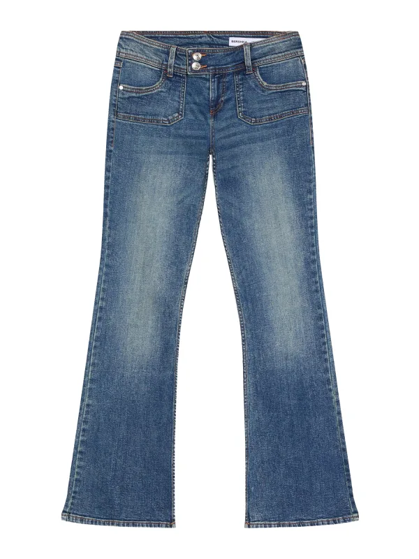 Design: Gevoerde zoom/rand, Ritssluiting, Achterzak, Zakken aan de zijkant, Knop sluiting; Type sluiting: Knoopsluiting; Materiaal: Denim; Motief: Effen; Extra's: Studs, Contrasterende naden, Gewassen effect, Vaste grip, Riemlussen; Wassing: Heavy washed; Lengte: Lang/maxi; Pasvorm: Flared; Taillehoogte: Low waist