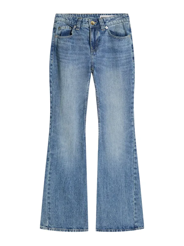 Design: 5-pocket-style, Opzet-/flapzak; Type sluiting: Ritssluiting; Materiaal: Denim; Motief: Effen; Extra's: Studs, Contrasterende naden, Riemlussen; Wassing: Heavy washed; Lengte: Lang/maxi; Pasvorm: Flared; Taillehoogte: Mid waist