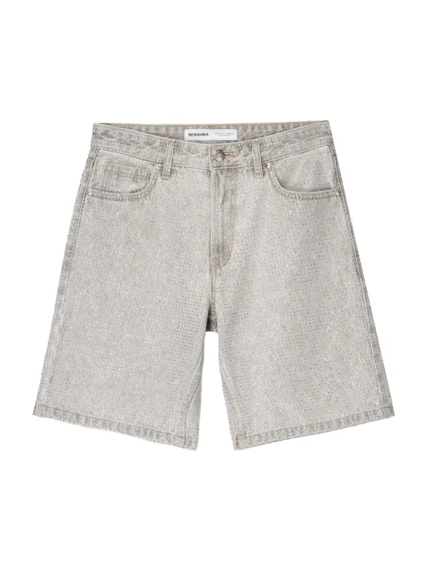 Design: Gevoerde zoom/rand, Ritssluiting, 5-pocket-style; Type sluiting: Ritssluiting; Materiaal: Denim; Motief: Effen; Details: Sierstenen; Extra's: Glitterend, Contrasterende naden, Vaste grip, Riemlussen; Wassing: Light washed; Lengte: Knielengte; Pasvorm: Loosefit; Taillehoogte: Mid waist