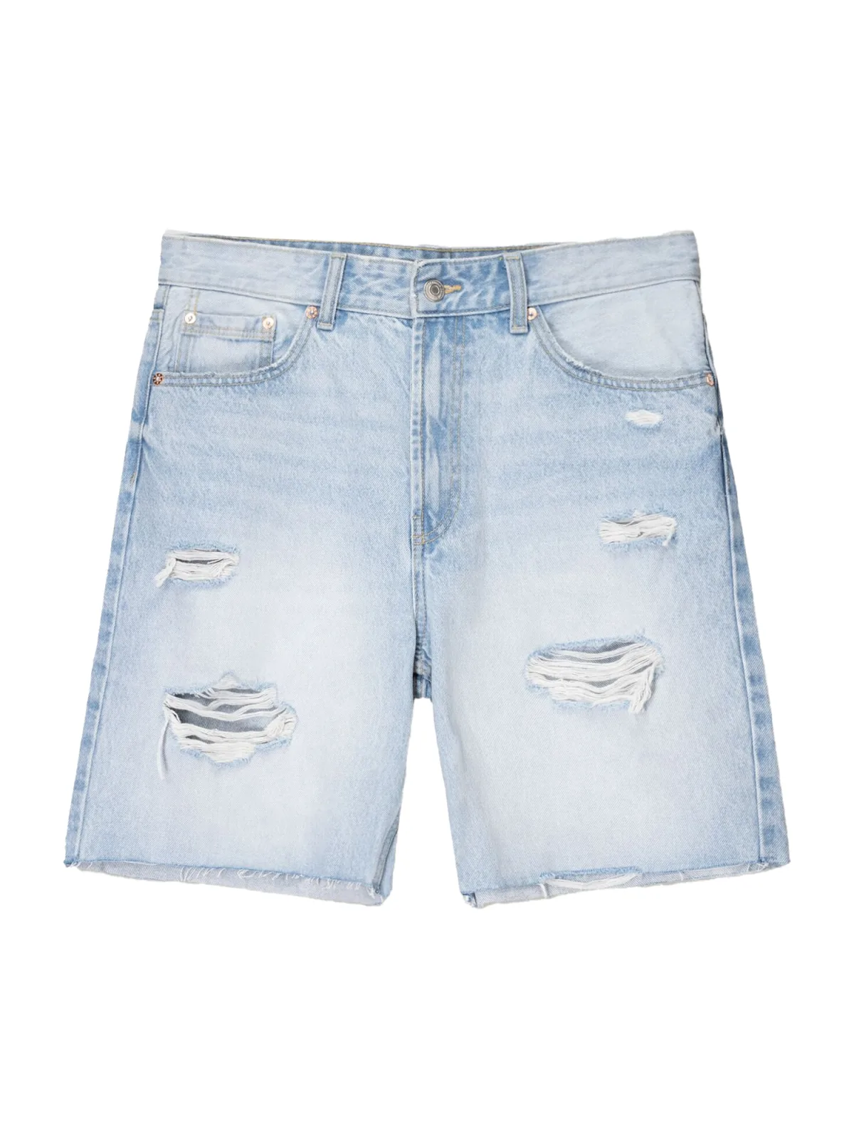 Design: Gefranjerde zoom, Open randen, Ritssluiting, 5-pocket-style; Type sluiting: Ritssluiting; Materiaal: Denim; Motief: Effen; Extra's: Studs, Contrasterende naden, Vaste grip, Riemlussen; Wassing: ripped; Lengte: Knielengte; Pasvorm: Regular