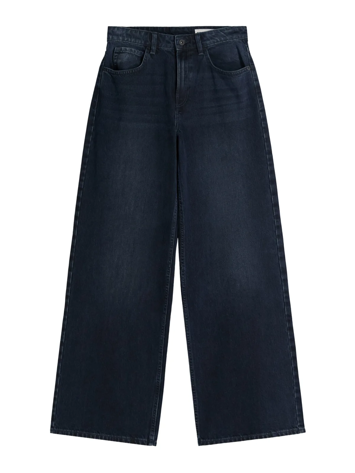 Design: 5-pocket-style; Type sluiting: Ritssluiting; Materiaal: Denim; Motief: Effen; Extra's: Studs, Gewassen effect, Riemlussen; Wassing: Heavy washed; Lengte: Lang/maxi; Pasvorm: Wide leg; Taillehoogte: Mid waist