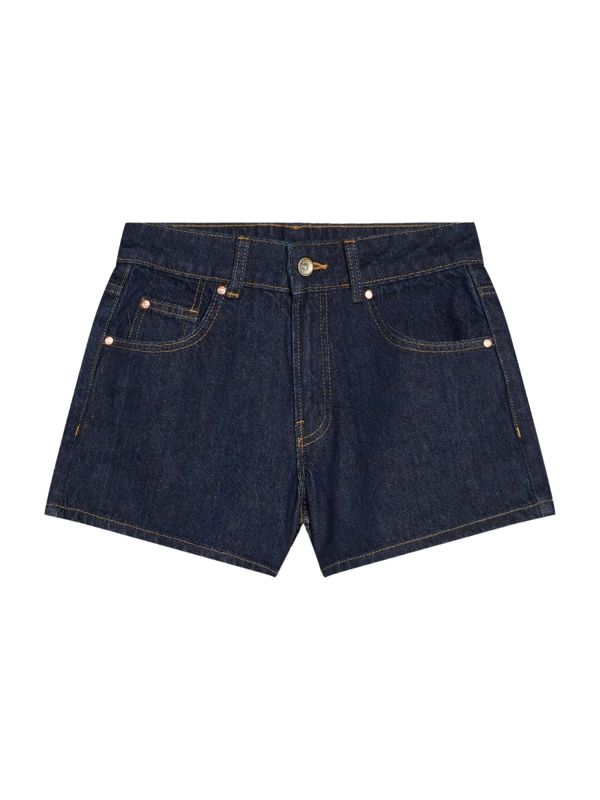 Design: Gevoerde zoom/rand, Ritssluiting, 5-pocket-style, Knop sluiting; Type sluiting: Ritssluiting; Materiaal: Denim; Motief: Effen; Extra's: Studs, Contrasterende naden, Gewassen effect, Vaste grip, Riemlussen; Wassing: Rinsed/dark washed; Lengte: Kort/mini; Pasvorm: Regular; Taillehoogte: Mid waist