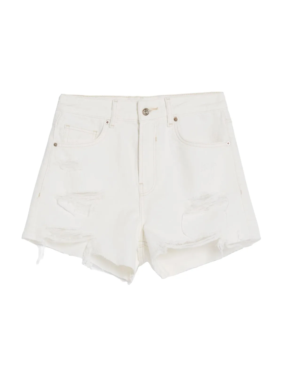 Design: Gefranjerde zoom, Ritssluiting, 5-pocket-style; Type sluiting: Ritssluiting; Materiaal: Denim; Motief: Effen; Details: Cut-outs, Franjes; Extra's: Studs, Used-look, Riemlussen; Wassing: Colored denim; Lengte: Kort/mini; Pasvorm: Regular; Taillehoogte: High waist