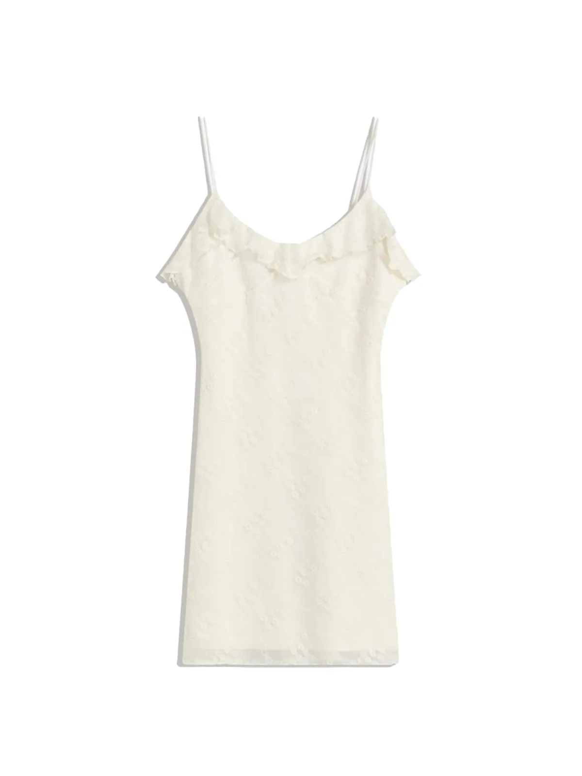 Design: Rechte zoom, Diepe snit/decolleté, Om te knopen/binden; Halstype: Ronde hals; Motief: Effen; Soort bandjes: Spaghettibandjes; Details: Borduursels, Volant; Extra's: Lichte stof, Met textuur; Lengte: Kort/mini; Snit: Figuur omarmend; Pasvorm: Slanke pasvorm; Armlengte: Mouwloos