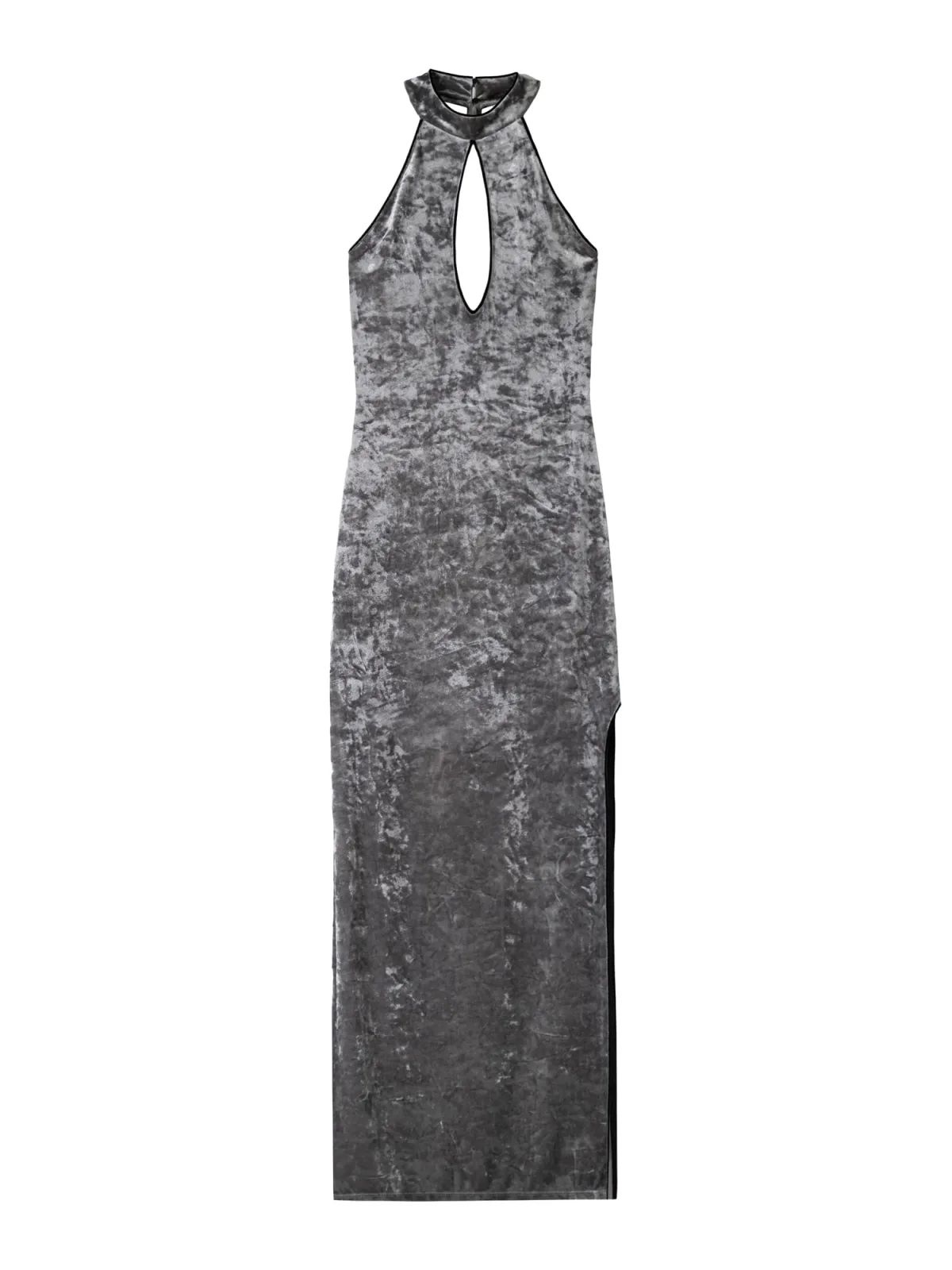 Design: Beenopening, Keyholesluiting, Diepe snit/decolleté; Type sluiting: Knoopsluiting; Materiaal: Fluweel/Nicky Velours; Halstype: Opstaande kraag; Motief: Effen; Soort bandjes: Haltermodel; Details: Cut-outs; Extra's: Op staal naden, Gladde stof; Lengte: 3/4 lengte; Snit: Figuur omarmend; Pasvorm: Aansluitende pasvorm; Armlengte: Mouwloos