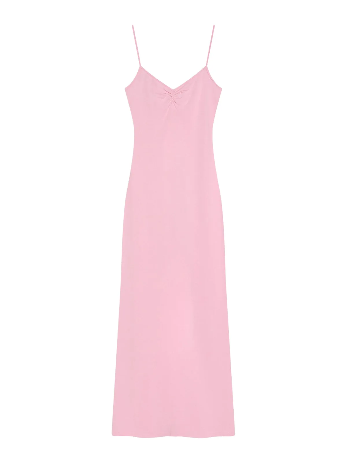 Design: Gevoerde zoom/rand, Rechte zoom, Diepe snit/decolleté; Materiaal: Jersey; Halstype: V-hals; Motief: Effen; Soort bandjes: Spaghettibandjes; Details: Gedrapeerd, Backless; Extra's: Op staal naden, Gladde stof, Voelt zacht aan; Lengte: Lang/maxi; Snit: Uitlopend; Pasvorm: Slanke pasvorm; Armlengte: Mouwloos