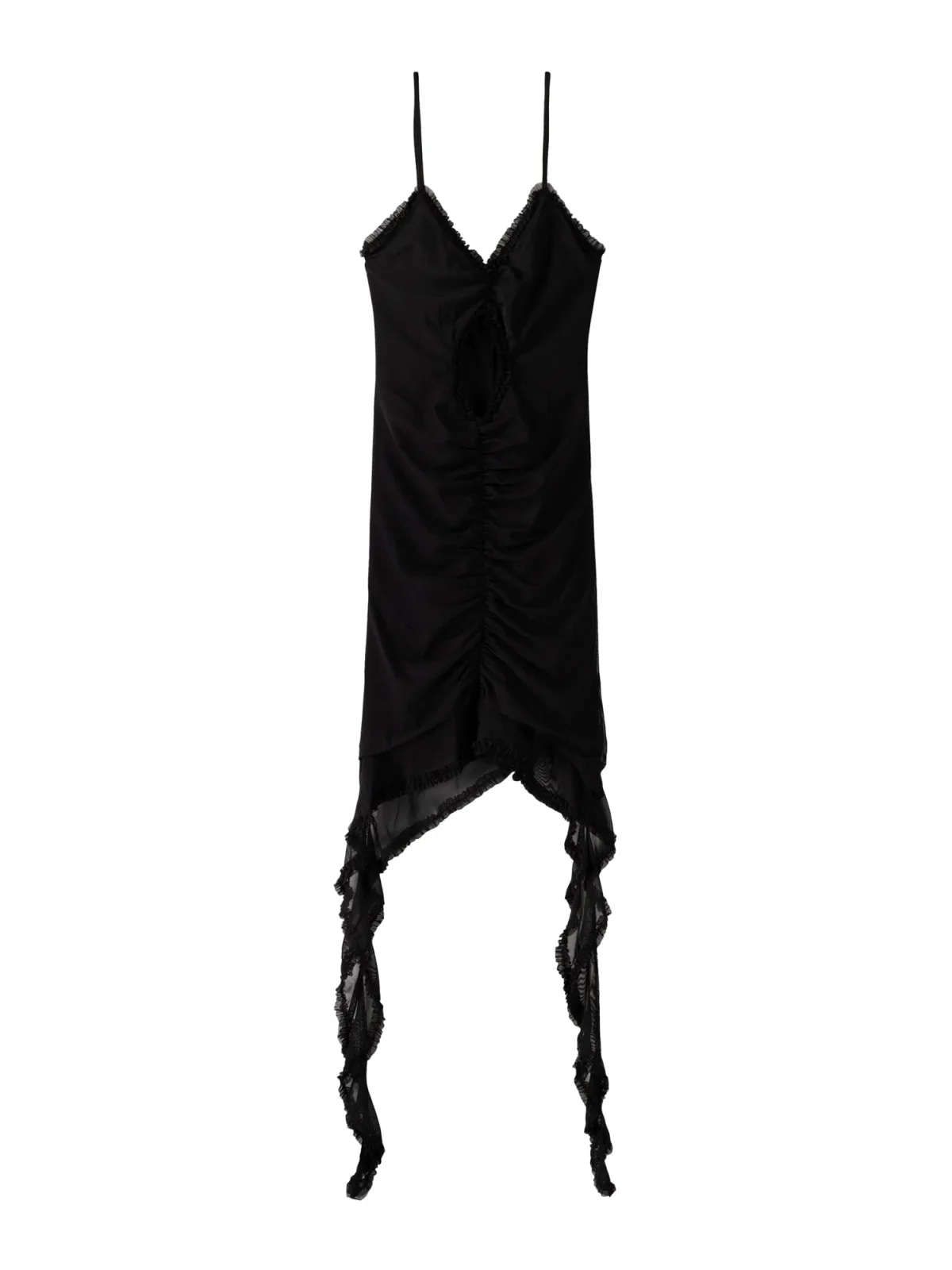 Design: Asymmetrische zoom, Diepe snit/decolleté; Halstype: V-hals; Motief: Effen; Soort bandjes: Spaghettibandjes; Details: Cut-outs, Ruches; Extra's: Op staal naden, Lichte stof; Lengte: Kort/mini; Snit: Figuur omarmend; Pasvorm: Aansluitende pasvorm; Armlengte: Mouwloos