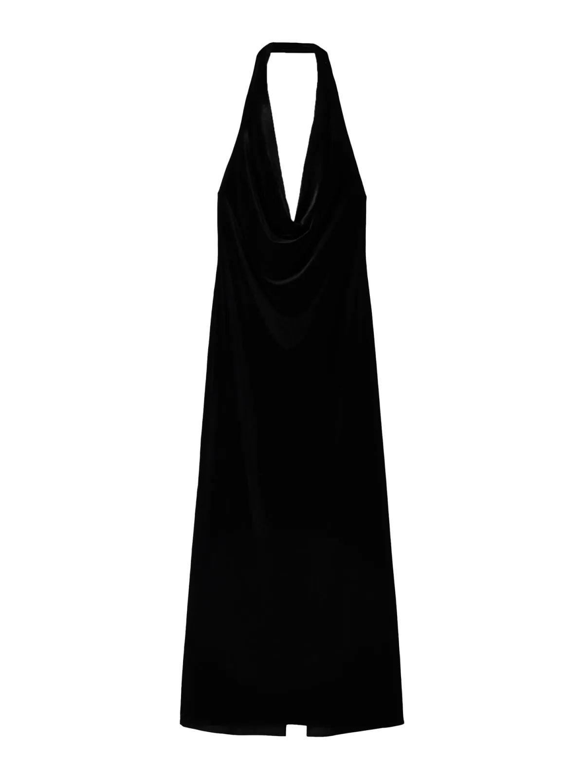 Design: Split, Rechte zoom, Wikkel-look; Materiaal: Fluweel/Nicky Velours; Halstype: V-hals; Motief: Effen; Soort bandjes: Haltermodel; Details: Gedrapeerd, Backless; Extra's: Op staal naden, Voelt zacht aan; Lengte: 3/4 lengte; Snit: Getailleerd; Pasvorm: Slanke pasvorm; Armlengte: Mouwloos