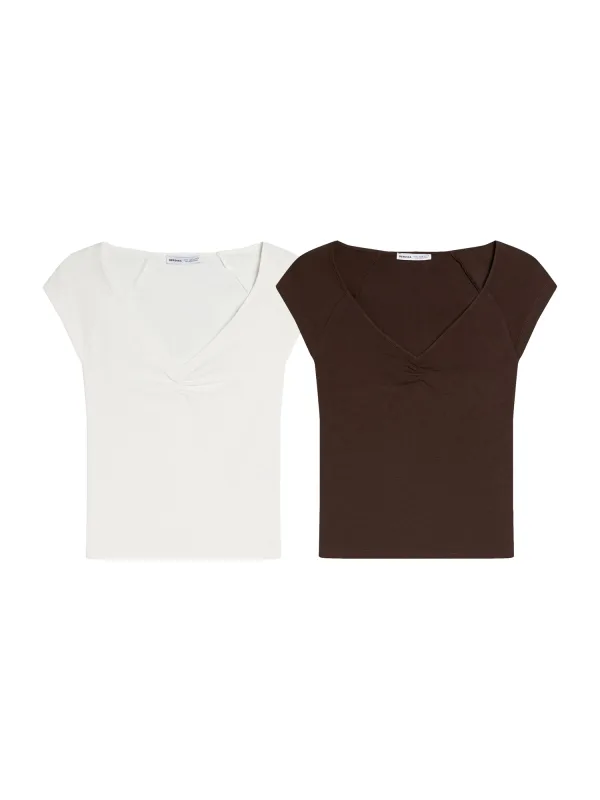 Design: Gevoerde zoom/rand, Raglanmouwen, Diepe snit/decolleté; Materiaal: Jersey; Halstype: V-hals; Motief: Effen; Details: Gedrapeerd; Extra's: Op staal naden, Voelt zacht aan, Huidvriendelijk materiaal; Pasvorm: Slanke pasvorm; Aantal: 2 Pack; Armlengte: Kwartmouw; Lengte: Normale lengte