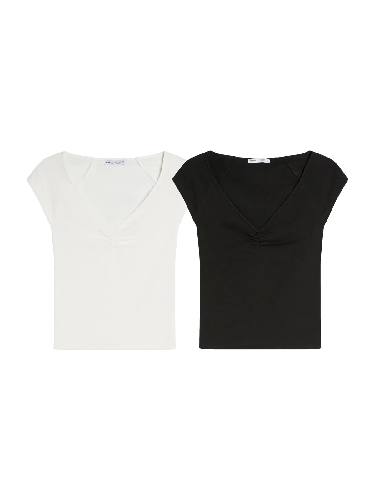 Design: Gevoerde zoom/rand, Rechte zoom, Raglanmouwen, Diepe snit/decolleté, Ingelegde kraag; Materiaal: Jersey; Halstype: V-hals; Motief: Effen; Details: Gedrapeerd; Extra's: Op staal naden, Voelt zacht aan; Pasvorm: Slanke pasvorm; Aantal: 2 Pack; Armlengte: Kwartmouw; Lengte: Normale lengte