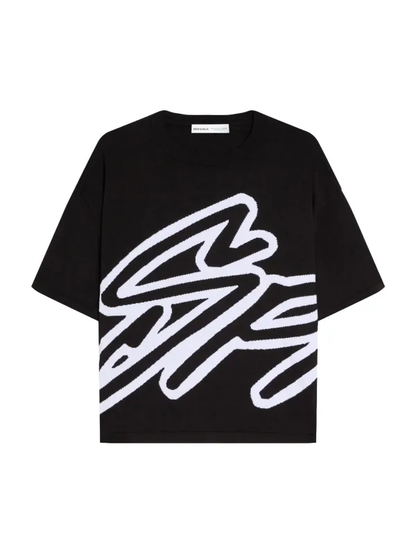 Design: Geribbelde kraag, Rechte zoom, Overcut schouder; Materiaal: Knitwear; Halstype: Ronde hals; Motief: Tekst print; Extra's: Op staal naden, Voelt zacht aan; Pasvorm: Wijde pasvorm; Armlengte: Halve mouw; Lengte: Normale lengte