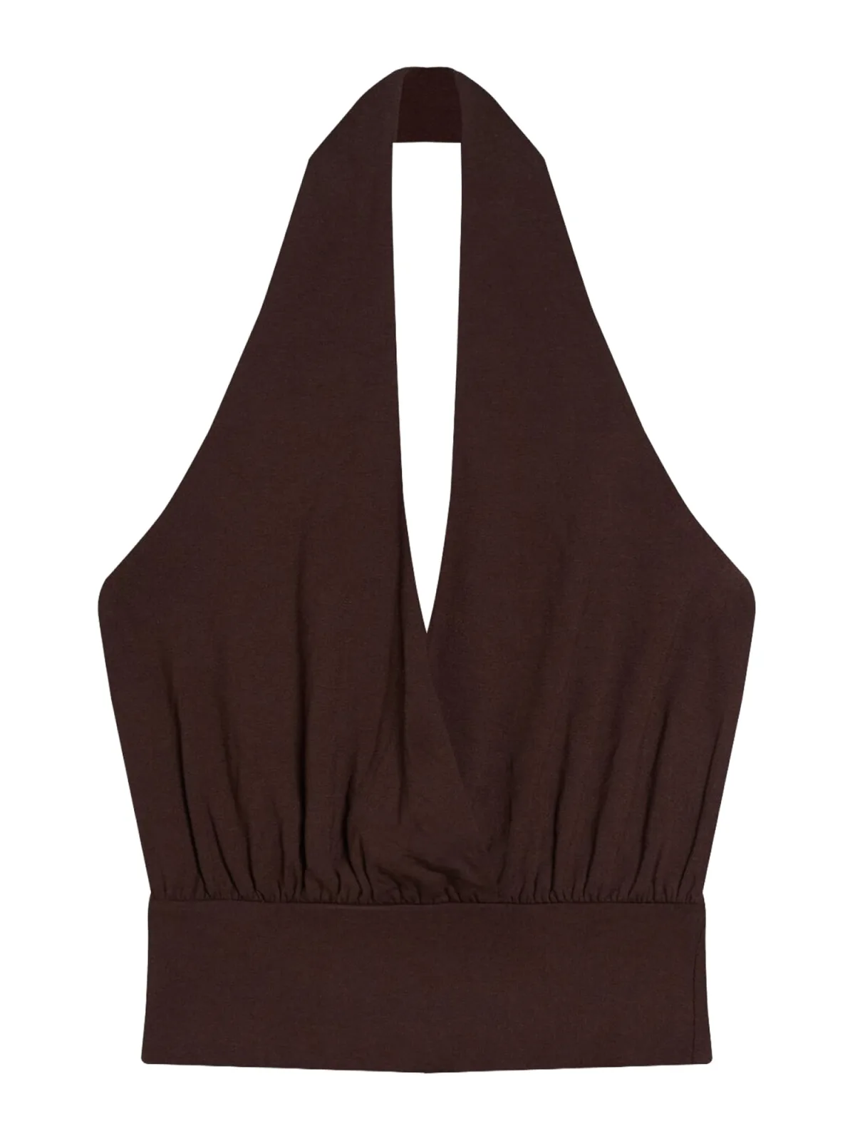 Design: Rechte zoom, Diepe snit/decolleté, Uitgesneden rug; Materiaal: Jersey; Halstype: Wikkeltop; Motief: Effen; Soort bandjes: Haltermodel; Details: Gedrapeerd, Backless, Wikkel design; Extra's: Op staal naden, Gladde stof, Voelt zacht aan; Pasvorm: Slanke pasvorm; Armlengte: Mouwloos; Lengte: Korte pasvorm