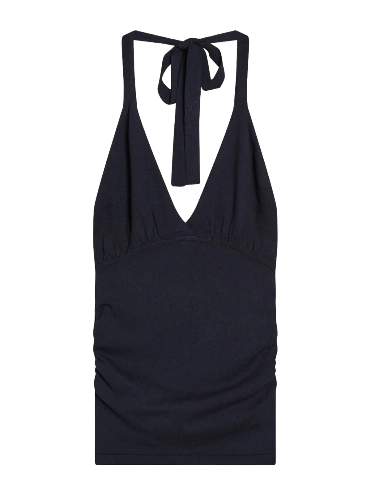 Design: Rechte zoom; Materiaal: Jersey; Halstype: V-hals; Motief: Effen; Soort bandjes: Haltermodel; Details: Gedrapeerd, Backless; Extra's: Op staal naden, Voelt zacht aan; Pasvorm: Slanke pasvorm; Armlengte: Mouwloos; Lengte: Normale lengte