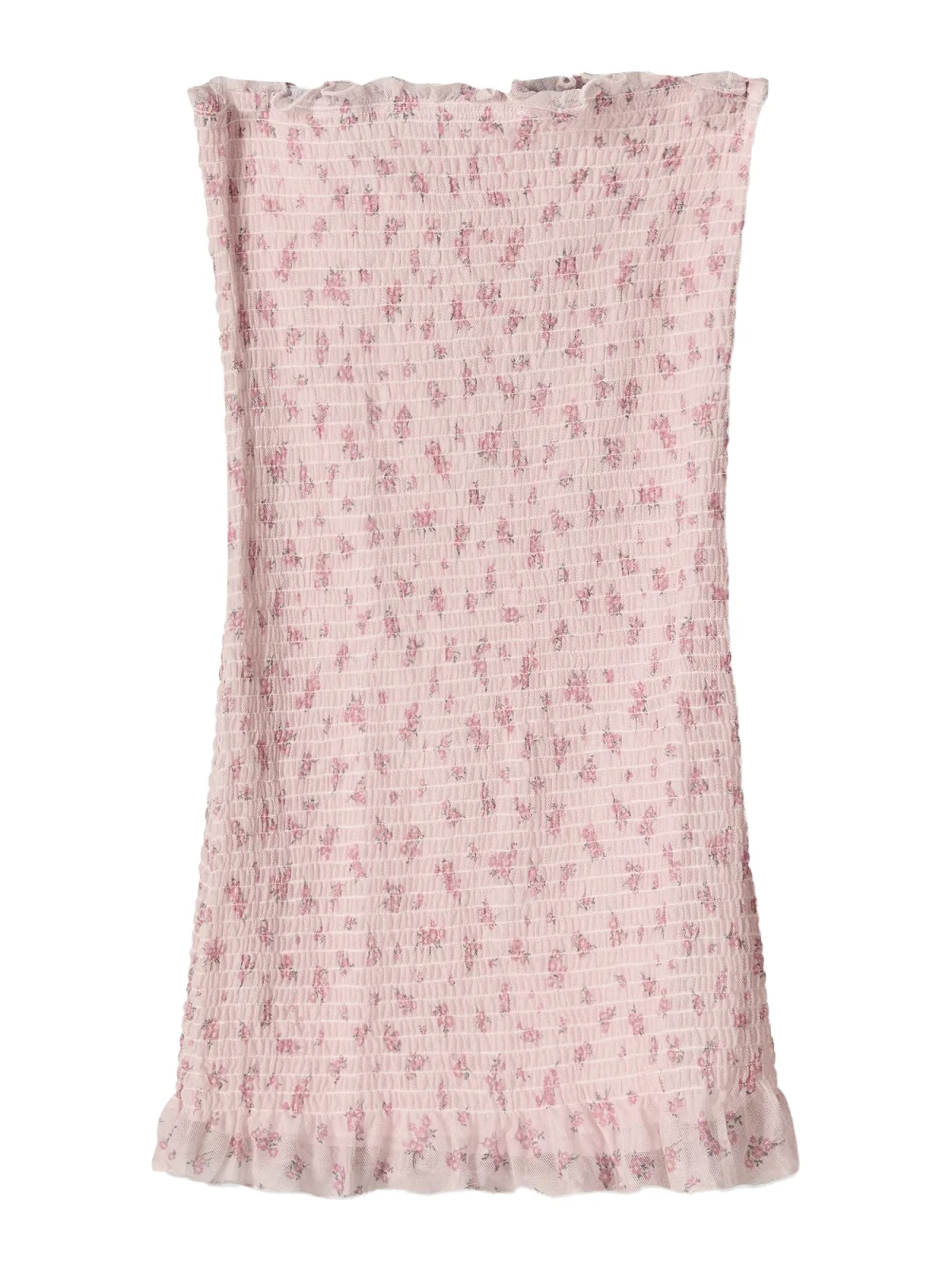 Design: Gevoerde zoom/rand, Rechte zoom; Materiaal: Gerecycled materiaal; Motief: Bloemenprint; Soort bandjes: Bandeau; Details: Ruches, Gedrapeerd; Extra's: All-over patroon, Gladde stof; Lengte: Kort/mini; Snit: Figuur omarmend; Pasvorm: Aansluitende pasvorm; Armlengte: Mouwloos