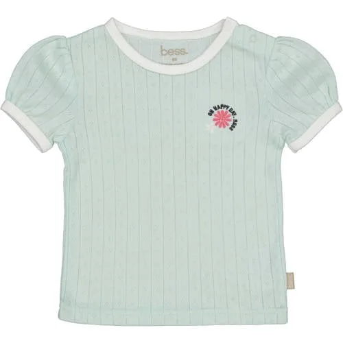 Fris, luchtig en zacht op de huid, dit lichtgroene meisjes T-shirt van katoen van BESS is ideaal voor elke dag. Het rechte model met ronde hals en korte mouwen geeft je kleintje alle bewegingsvrijheid om te kruipen, spelen en ontdekken. De subtiele details geven het shirt net wat extra's, zonder dat het te druk oogt.Lief design met speelse details Lichtgroene kleur die makkelijk combineert met leggings, broekjes en rokjes Zachte stof van 100% katoen die comfortabel aanvoelt op de gevoelige babyhuid Ajourdetails en fijne borduursels voor een verfijnde uitstraling Contrast bies die het T-shirt een speels accent geeft Pofmouwen met korte mouwlengte voor een zacht, rond silhouet Printopdruk aan de voorkant als rustig detail Geen sluiting, waardoor aankleden snel en eenvoudig gaat Geschikt voor New Born en baby, passend binnen de Daily collectieMakkelijk in het dagelijks gebruikHet T-shirt is wasbaar op 30 graden en kan warm gestreken worden (2 punten). Niet drogen in de droogtrommel zorgt ervoor dat de stof en details mooi blijven. Zo is het shirt snel weer klaar voor een nieuwe dag vol avontuur.BESS voor de allerkleinstenBESS richt zich speciaal op babykleding die praktisch is in gebruik. Met aandacht voor pasvorm, zachte materialen en doordachte details biedt BESS een collectie waarin je elke dag gerust kunt grijpen.Een comfortabel basis T-shirt voor alle dagelijkse momenten met je kleintje.