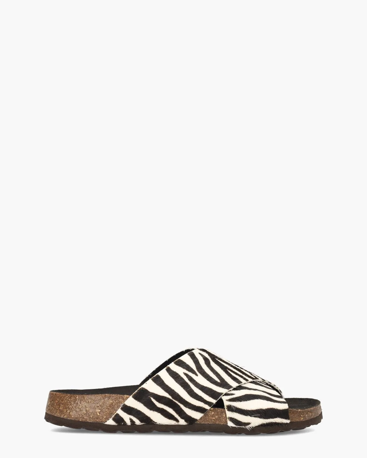 Ontdek de trendy damesslippers genaamd Teddy uit de collectie van Cypres. Deze stijlvolle slides, met kruisbanden over de wreef, zijn voorzien van een bovenkant van ponyhair met een opvallende zebraprint. De voering is vervaardigd van zacht microfiber en het voorgevormde voetbed van suède en kurk biedt extra comfort tijdens het lopen. De