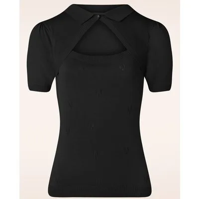 Bolero of top? Deze top heeft het beste van beide werelden! Ze lijkt op een topje met daarover een losse bolero maar het zit gewoon aan elkaar vast ;-) Bovendien zorgen het speelse kraagje, kleine knoopje, korte pofmouwen en het opengewerkte motiefje ervoor dat je haar gewoon WILT hebben. Ze is uitgevoerd in een soepele, stretchy, fijngebreide viscosemix in zwart die heerlijk draagt. Must-have! * Kraagje * Knoopje * Korte pofmouwen * Opengewerkt motiefje * Stretchy ribboorden * Lang genoeg om op een normale heupbroek te dragen