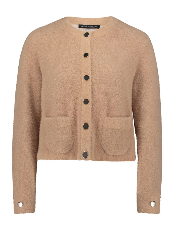 Dit vest heeft een zachte, bouclé-achtige kwaliteit in een beige tint. De ronde hals zonder kraag oogt modern en vrouwelijk. De voorzijde sluit met stevige metalen drukknopen en heeft twee opgestikte zakken met afgeronde hoeken. De lange mouwen tonen een verfijnd knoopdetail aan de manchetten. Het kortere, rechtvallende silhouet geeft je outfit direct vorm en comfortabel draaggemak. Afgewerkt met oog voor detail door Betty Barclay.