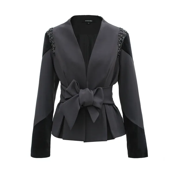 Een originele snit met fluwelen uitsparingen op schouders en manchetten. Een eenvoudige verfijnde halslijn waarmee je shirts of blouses kunt dragen met verfijnde kragen zoals ascot -banden. Grote riem om rond de taille te binden. Een aantrekkelijk stuk gecombineerd met jeans, sigarettenbroek, een rechte of wijd uitlopende rok. Een veilige gok om in de seizoenen te dragen. Kies met of zonder borduurwerk op je schouders. Productdetails: • Formulier: kleermaker, gemonteerd • Lengte: 63 cm • Lange mouwen • v -neck • Middenkoppeling