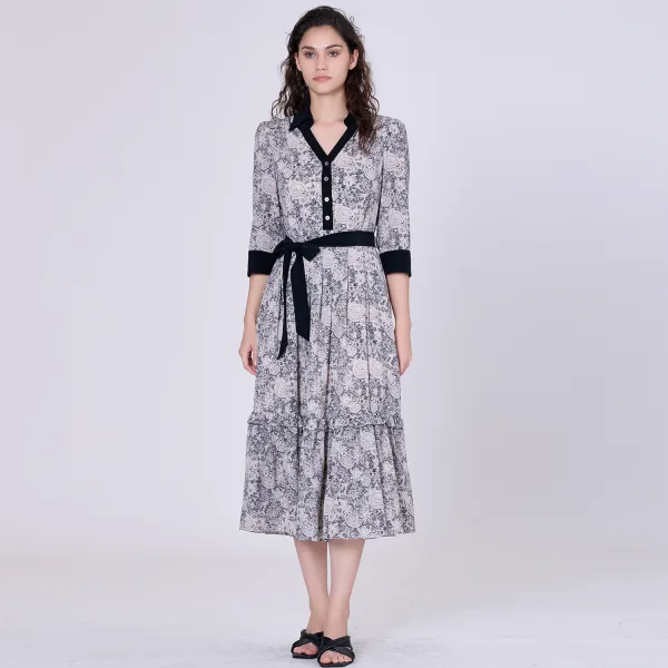 Een gedrukt stuk gestructureerd met contrasterende elementen: polsen, riem, plaket midden vooraan en kraag. Zowel dynamische als klassieke snit, deze jurk benadrukt elegant de taille en beschikt over een volume royaal oplaaien door zijn vluchtige zoom. Een sierlijk silhouet dat geschikt is voor semi-formele gelegenheden zoals een brunch, een tuinfeest of die ook op kantoor kan worden gedragen. Productdetails: Lengte: 124 cm Model draagt maat 10 Modelhoogte is 5 "7 Vorm: fit-and-flare 3/4 mouwen Kraag Stoffengordel verstrekt