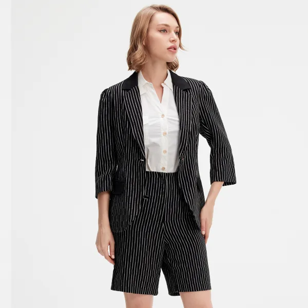 Een klassieke en vleiende snit voor dagelijkse slijtage. Deze jas is gesneden uit een ademende gestreepte stof, verfraaid met een mat satijn op zakflappen en kraag. Een stuk dat tegelijkertijd een chique en casual blik brengt. Het wordt geassocieerd met vele looks; Bijvoorbeeld: t-shirt en jeans voor een informele stijl, of ons "mouwloze shirt met flappen op schouders" en "rechte gestreepte shorts". Productdetails • Vorm: kleermaker, gemonteerd • Lengte: 68 cm • Mouwen 3/4 • Geklassing • Midden voorgeknoopt