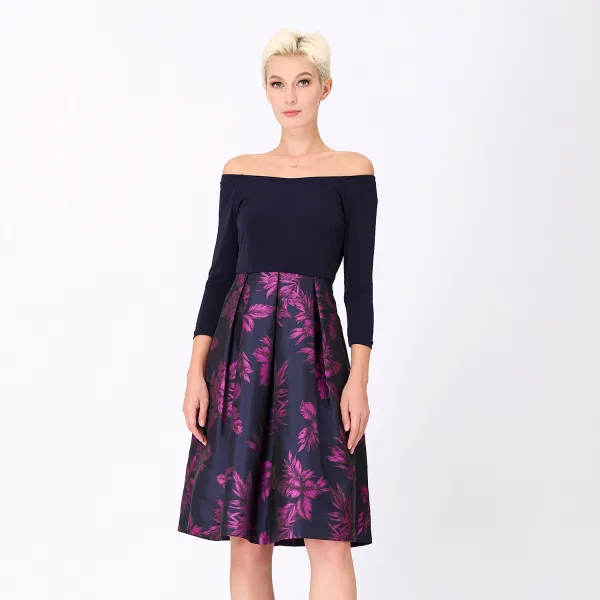 Een jurk die is gestructureerd met een lijfje in Jersey die een "ballerina" -look en een verfijnde bloemenjacquard rok brengt. Een statement -stuk dat elegant het silhouet onderstreept zijn getailleerde taille en zijn royaal wijd uitlopende rok met diepe plooien. Een veelzijdige jurk, geschikt voor verschillende gelegenheden, kan worden gekoppeld aan platte pompen, hakken of laarzen. Productdetails: • Formulier: fit-and-flare • Lengte: 101 cm • 3/4 mouwen • Bardot -halslijn (blote schouders) of boothals • Onzichtbare rits aan de linkerkant