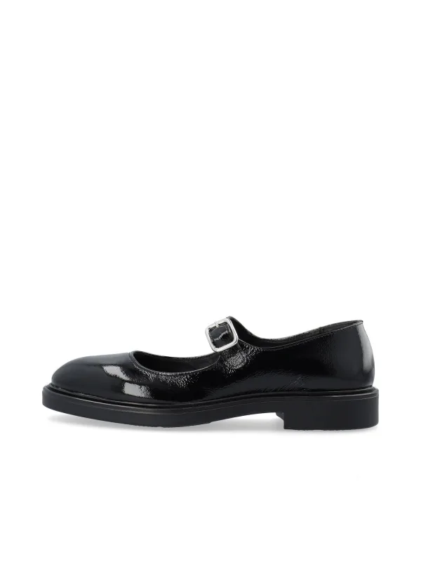 Design: Profielzolen, Versterkte hak; Type sluiting: Riemsluiting; Materiaal: Leer; Motief: Effen; Materiaal: Glad leer, Lak; Schoenneus: Ronde neus; Extra's: Gladde stof, Stevige stof, Flexibele zool; Hakhoogte: Platte hak (0-3 cm)