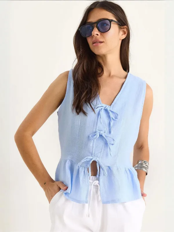 Blouse type: Blouseshirt; Design: Om te knopen/binden; Materiaal: Katoen; Motief: Effen; Kraag: Zonder kraag; Details: Volant, Gedrapeerd; Extra's: Gladde stof; Pasvorm: Normale pasvorm; Armlengte: Mouwloos; Lengte: Normale lengte