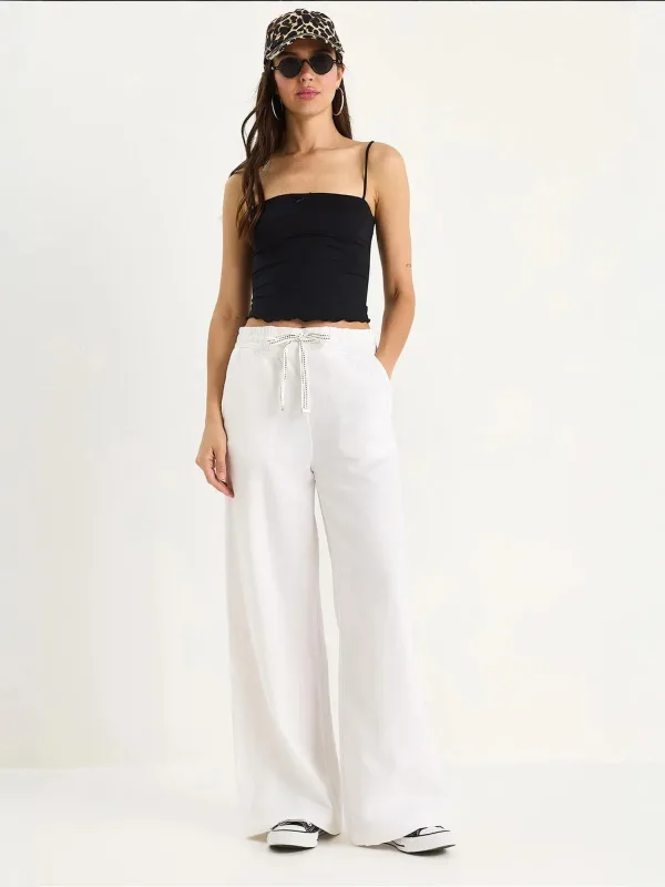Design: Taille met trekkoord; Materiaal: Sweatstof; Motief: Effen; Details: Gedrapeerd; Extra's: Voelt zacht aan; Lengte: Lang/maxi; Pasvorm: Wide leg; Taillehoogte: Mid waist