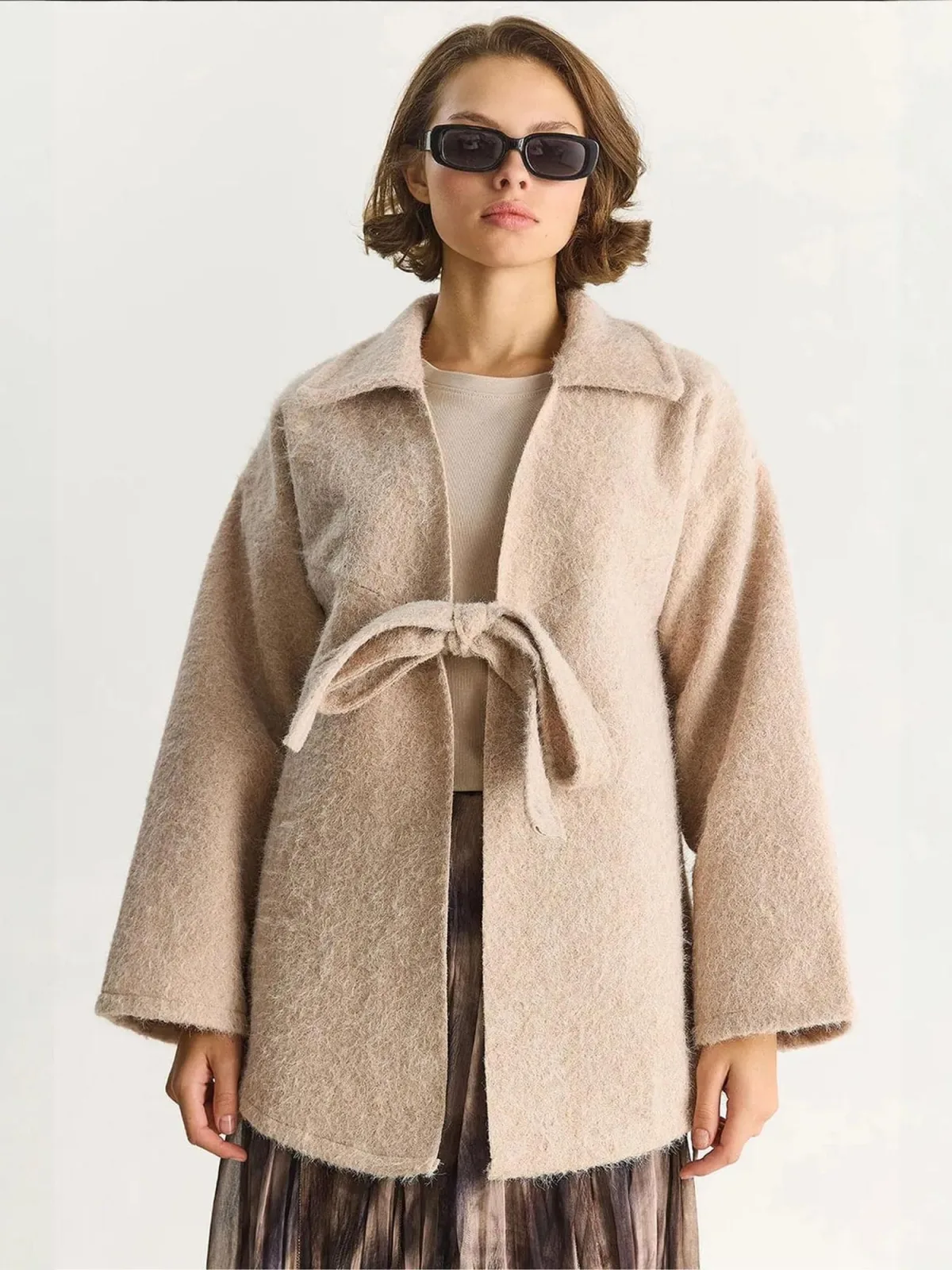 Design: Turn-down kraag, Om te knopen/binden; Materiaal: Knitwear; Motief: Mélange; Extra's: Met textuur; Pasvorm: Losse pasvorm; Armlengte: Lange mouw; Lengte: Lange pasvorm