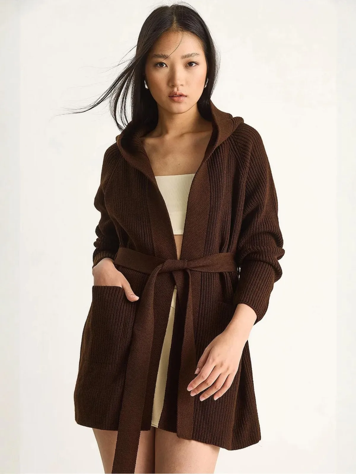 Design: Geribd ceintuurtje; Materiaal: Knitwear; Halstype: Capuchon; Motief: Effen; Extra's: Voelt zacht aan; Pasvorm: Normale pasvorm; Armlengte: Lange mouw; Lengte: Lange pasvorm