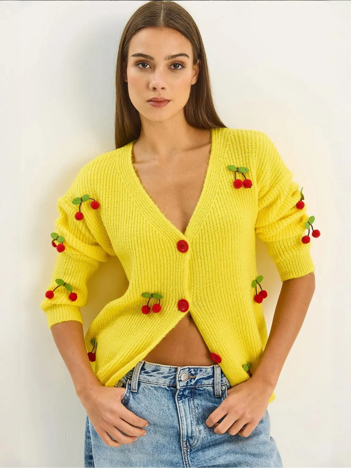 Design: Geribd ceintuurtje; Type sluiting: Knoopsluiting; Materiaal: Knitwear; Halstype: V-hals; Details: Patches; Extra's: Fully fashioned; Pasvorm: Normale pasvorm; Armlengte: Lange mouw; Lengte: Normale lengte